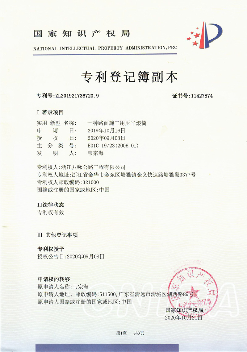 便捷式高速公路微型修补设备-实用新型专利证书(签章)